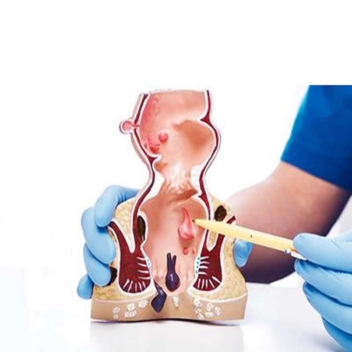 This anatomy model is a life-size frontal section of the rectum as well as a smaller relief on a pedestal. In addition to the anatomical structures of the rectum (sphincter, mucous membrane, venous plexus), the model shows internal hemorrhoids during stage I and II as well as external hemorrhoids. The relief exhibit shows hemorrhoids during stage third and fourth.